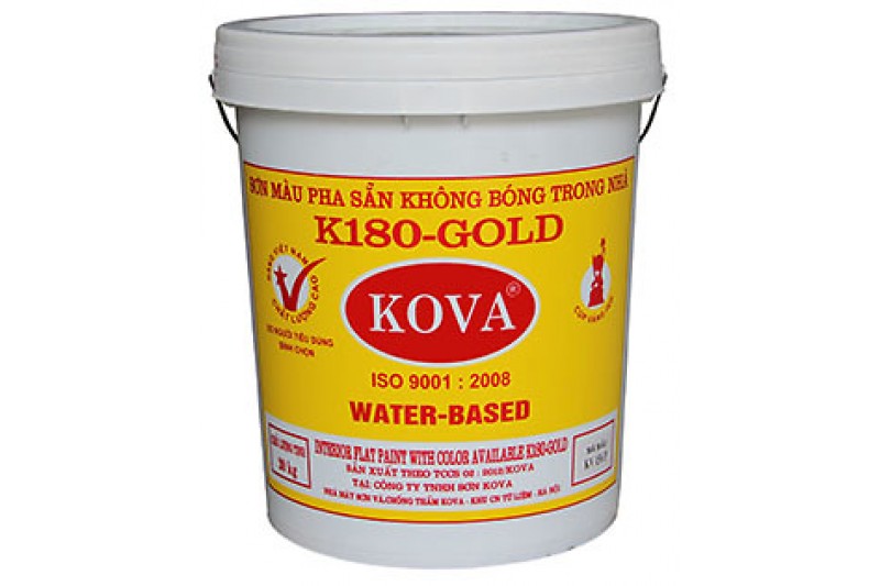 K180-Gold: là loại sơn hệ Acrylic phủ trong nhà, đã nhiệt đới hóa hoàn toàn, rất phù hợp với khí hậu nhiệt đới. Dùng để sơn phủ, sau khi làm phẳng tường bằng Matit KOVA MTT-Gold hoặc Bột bả KOVA MB-T. Có thể lăn trực tiếp khi tường đã khô và được lót bằng một loại sơn trắng trong nhà của KOVA.