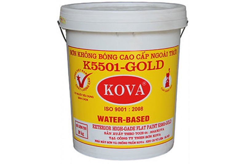K5501-Gold: là loại sơn phủ ngoài trời chất lượng cao, đã nhiệt đới hóa hoàn toàn, rất phù hợp với khí hậu nhiệt đới. Dùng để sơn phủ, sau khi làm phẳng tường bằng Matit KOVA MT-N hoặc Bột bả KOVA MB ngoài trời. Có thể lăn trực tiếp khi tường đã khô và được lót bằng sơn kháng kiềm K209-Gold hoặc một loại sơn trắng ngoài trời của KOVA.