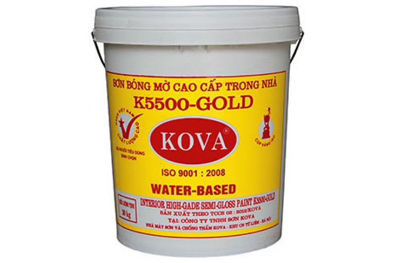 K5500-Gold: là loại sơn hệ nước Acrylic phủ trong nhà, đã hoàn toàn nhiệt đới hóa, rất phù hợp với khí hậu nhiệt đới. Dùng để sơn phủ, sau khi làm phẳng tường bằng Matit KOVA MTT-Gold hoặc Bột bả KOVA MB-T. Có thể lăn trực tiếp khi tường đã khô và được lót bằng sơn lót kháng kiềm hoặc một loại sơn trắng trong nhà của KOVA.
