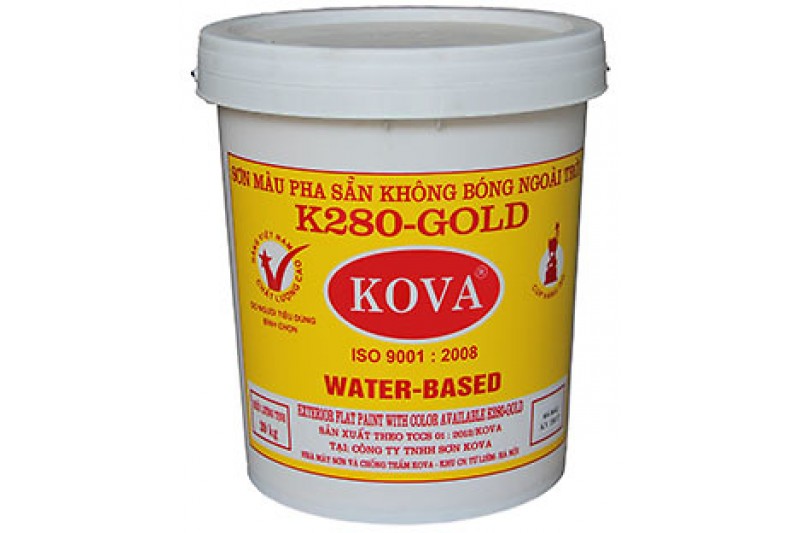 K280-Gold: là loại sơn hệ Acrylic 100% phủ ngoài trời, đã nhiệt đới hóa hoàn toàn, rất phù hợp với khí hậu nhiệt đới. Dùng để sơn phủ, sau khi làm phẳng tường bằng Matit KOVA MTN-Gold hoặc Bột bả KOVA MB-N. Có thể lăn trực tiếp khi tường đã khô và được lót bằng một loại sơn trắng ngoài trời của KOVA.